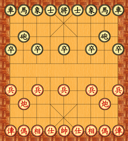 3선 양끝에서 한 칸 떨어진 자리에 포를 놓고, 4선에는 졸/병 5개를 1칸 간격으로 띄워서 놓는 것은 한국식 장기와 동일합니다.